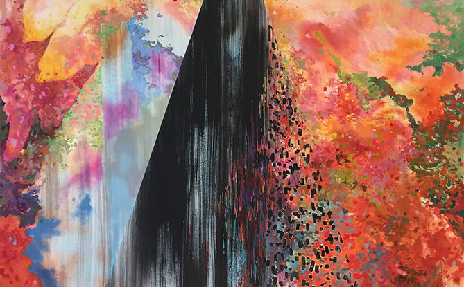My paintings present particular spaces or events occurring among multiple other particular spaces, events, and sensations. There is a sense of doom and optimism in the work as foreboding forms fracture and bright colors attempt to gain dominance over dark structures.